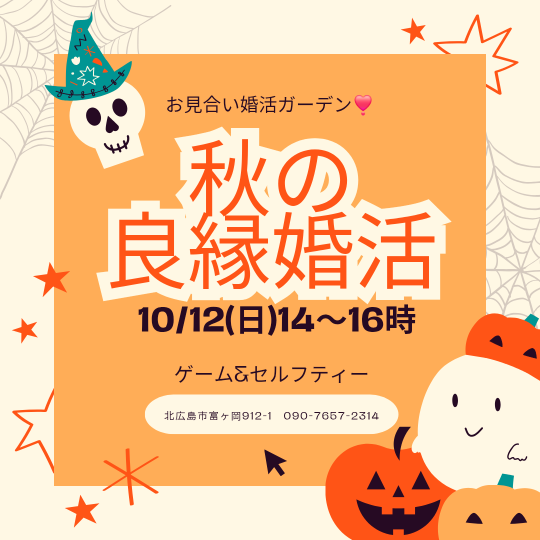 ハロウィーンを楽しもう♬ 2025 9/22 開催イベント ○ゲームでコミニュケーションアップ! ○フリードリンクは、会話が弾みます♬ ○紅葉🍁を眺めながら庭を散歩しませんか ○人の視線を感じないで過ごせます ○お見合いの練習にもなるから、Wで良好‼️ イベントカレンダー 読み込み中... 開催イベント 関連記事 さぁ~、人生を変えよう❣️ いよいよ!クリスマス🎄✨ クリスマス前の婚活❣️ クリスマス🎄前の婚活 カラオケ十八番を作ろう【満員御礼】 お月見 de 婚活 カラ♬婚 カラ♬婚